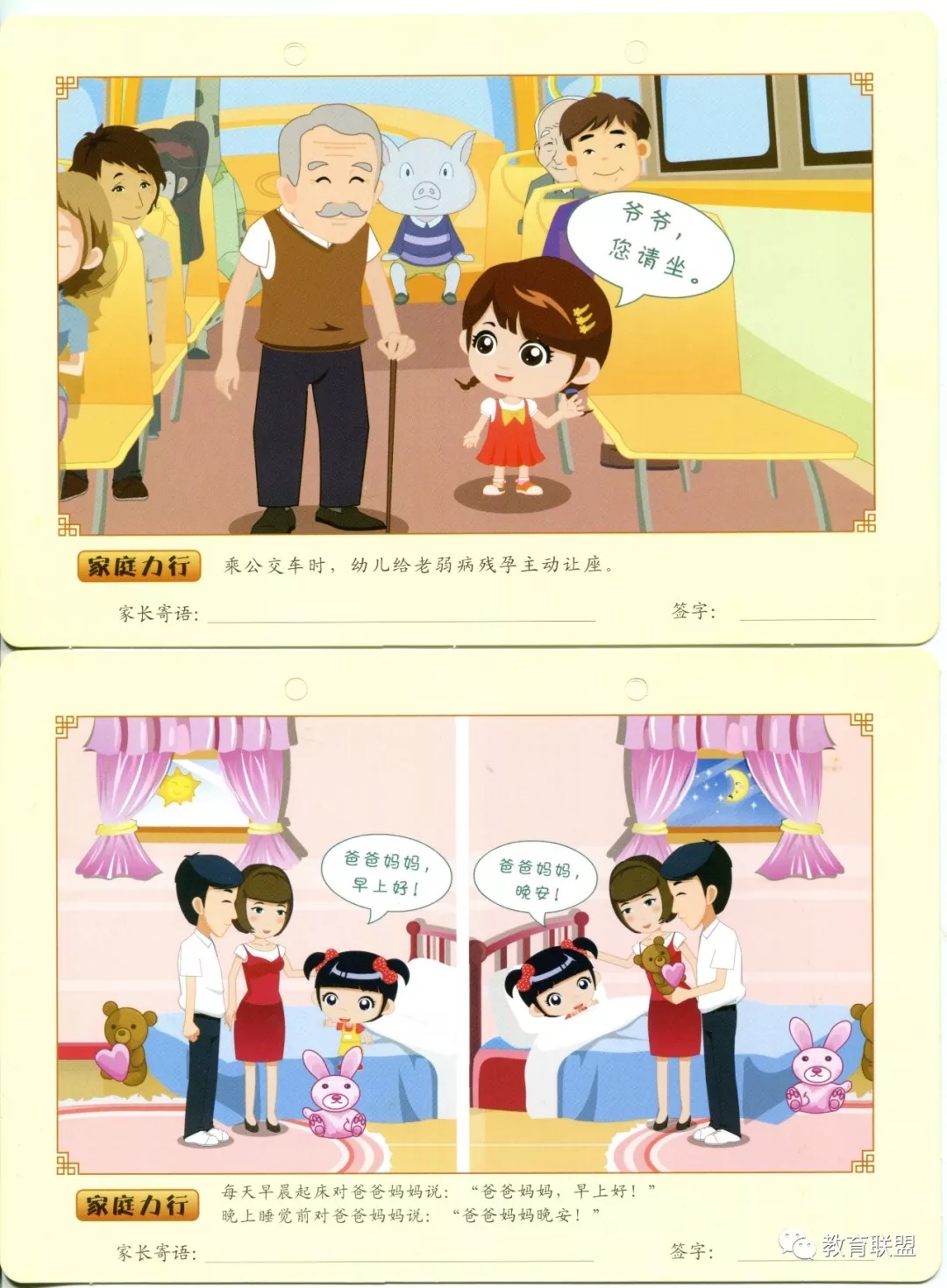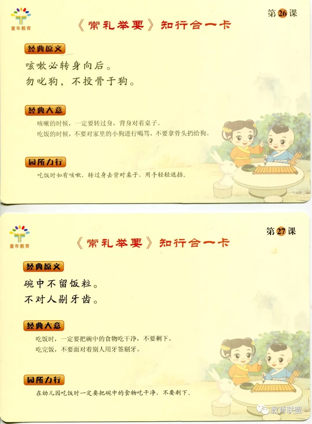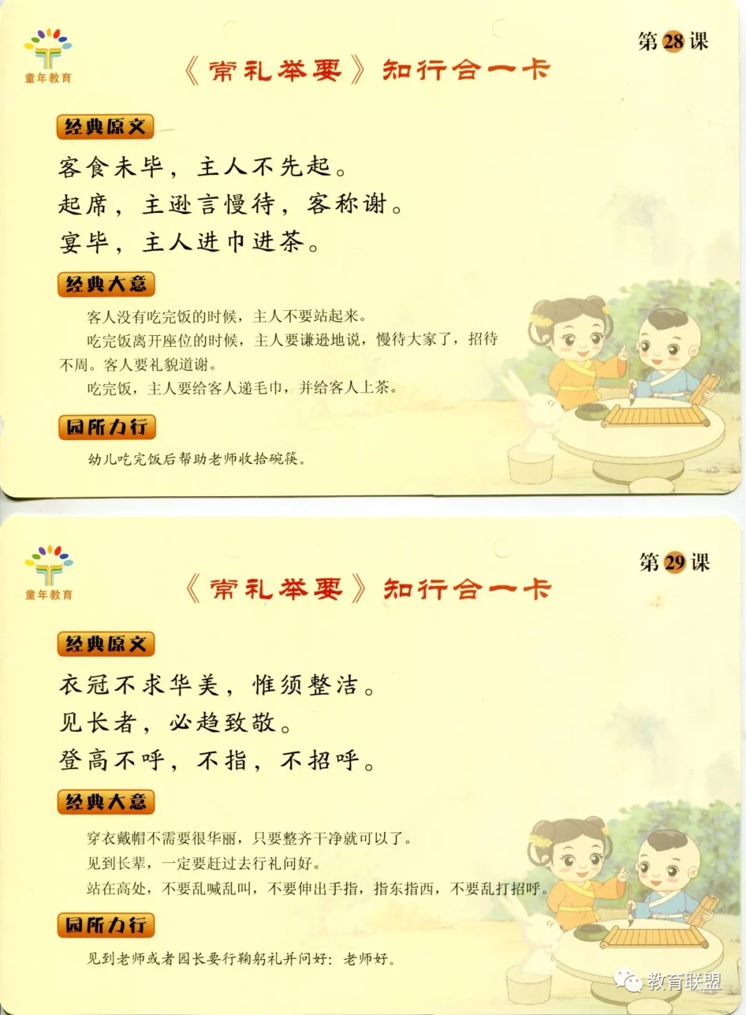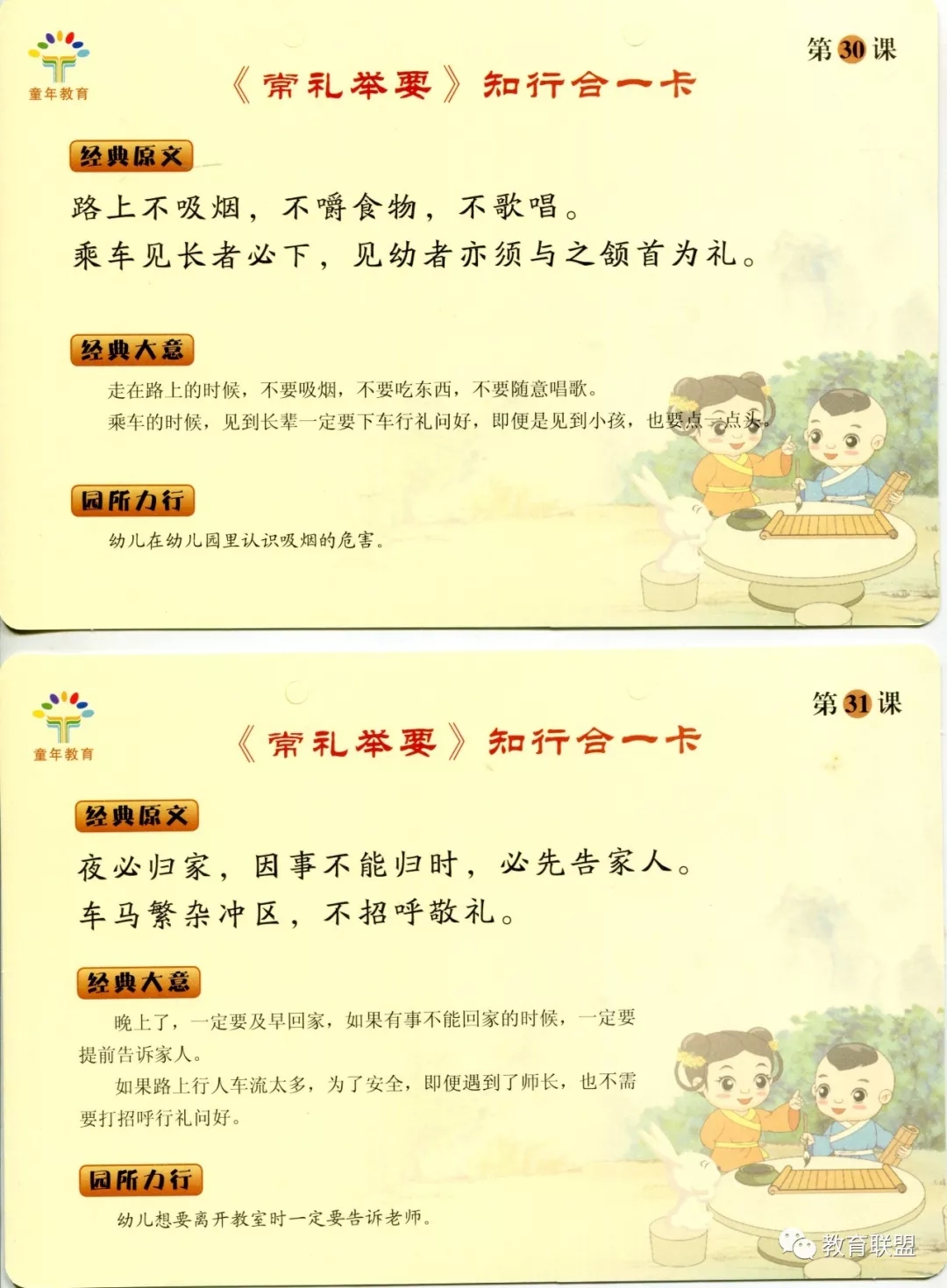 配套的知行合一卡可以 作为小朋友的小作业,国学学习的最终落脚点在力行,让幼儿能够学以致用,所以除了在幼儿园力行外,还要把国学的力行延伸到家里,让幼儿回到家里能有一个相关的小作业,真正让幼儿在做的过程中形成幼儿的行为习惯。