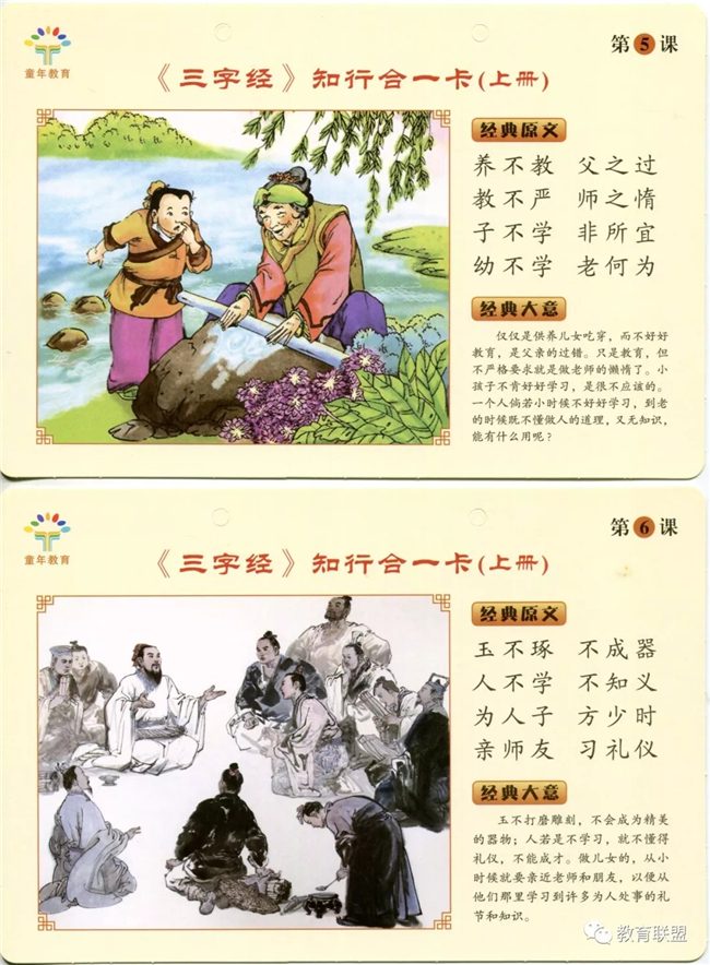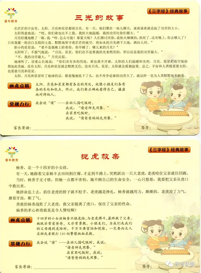 配套的知行合一卡可以 作为小朋友的小作业,国学学习的最终落脚点在力行,让幼儿能够学以致用,所以除了在幼儿园力行外,还要把国学的力行延伸到家里,让幼儿回到家里能有一个相关的小作业,真正让幼儿在做的过程中形成幼儿的行为习惯。