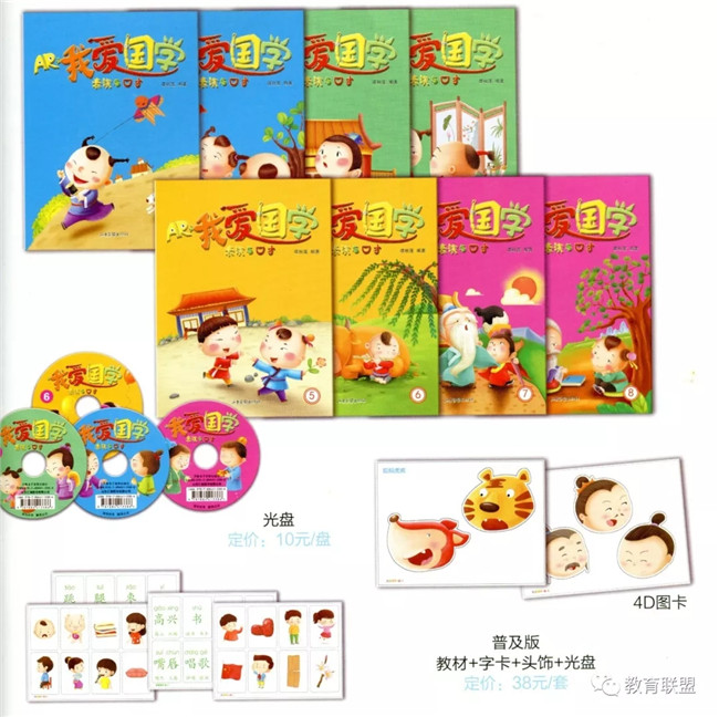 《我爱国学》总共8套,1、3、5、7为上册,2、4、6、8为下册,每册都包括:幼儿用书、延伸册、贴画、头饰、字卡、AR卡片、光盘定价:38.00。