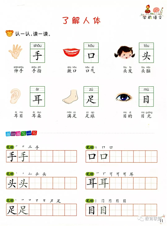 内容由识字、词语、句子、听读练习、看图说话、儿歌谜语、语言理解、语言应用等8个部分组合而成。