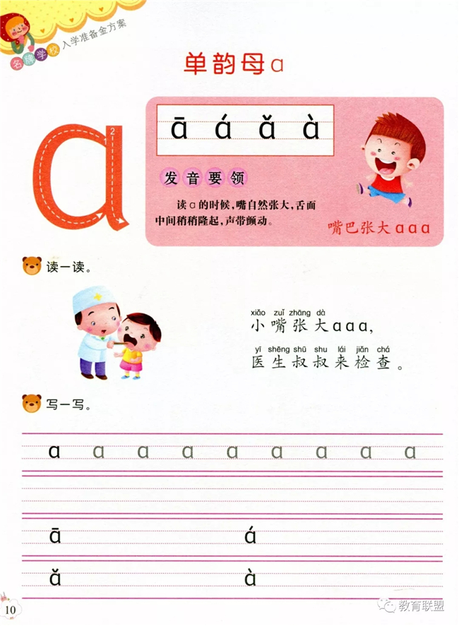 书本内容包含认识声调,认识声调口诀,认识拼音格。然后每个字母的学习,为小学打下好的基础!