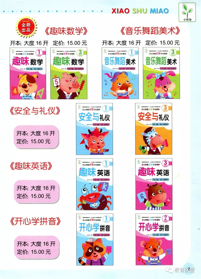 本教材由黑龙江美术出版社出版,上学期为1.3.5.7册、下学期为2.4.6.8册,包括:阅读识字、安全与礼仪、象形字卡、音乐舞蹈与美术、全脑数学、趣味英语,每本15.00元