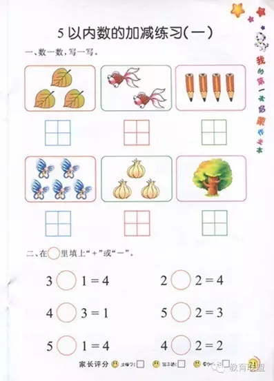 《数学启蒙作业本》7册,其中包括2册标准写数字作业本和5册加减训练作业本(分别是5,10,20,50,100以内的加减训练)。本书中的题目大多以图画的形式来表现,形象生动,能让幼儿在不知不觉中认识数字、学习加减。